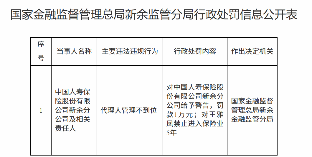 12月5日粤友优配,国家金融监督管理总局新余监管分局行政处罚信息公开表显示,中国人寿保险股份有限公司新余分公司及相关责任人因代理人管理不到位被警告并罚款1万元;王某凤被禁止进入保险业5年。
